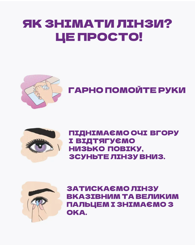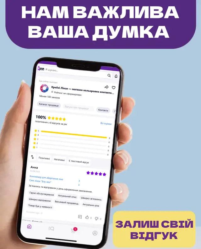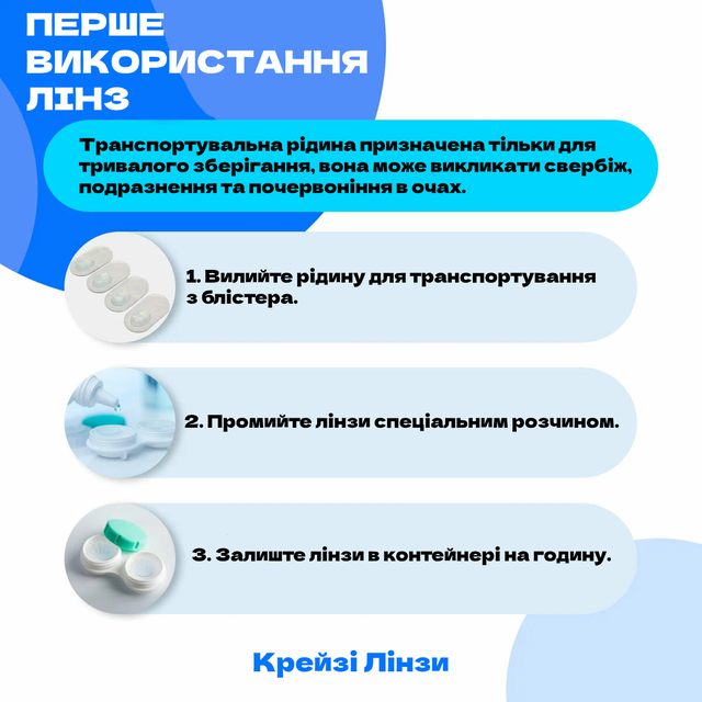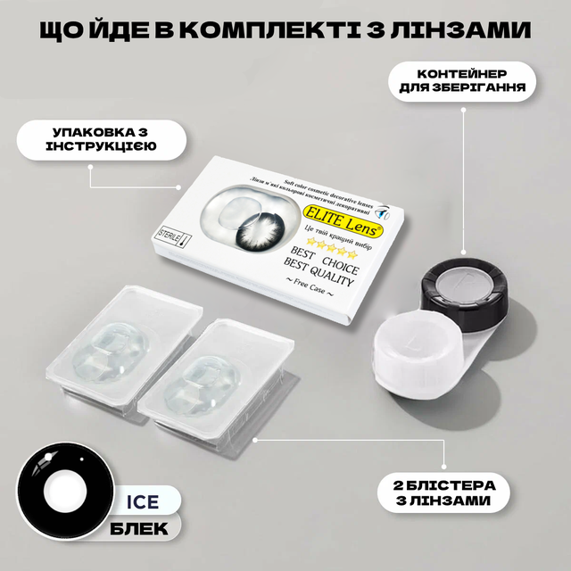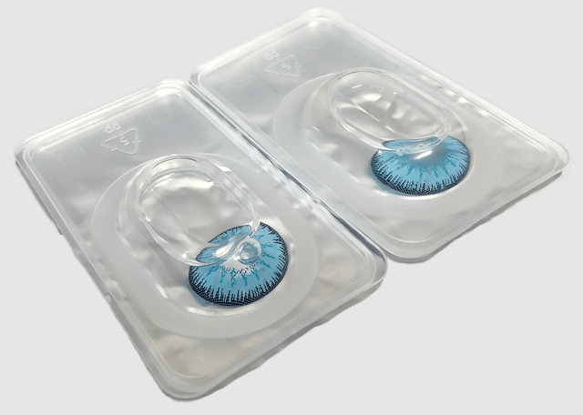 - Спосіб упаковки: Кольорові контактні лінзи постачаються в герметично запаяних блістерах, заповнених стерильним розчином. У комплект входить пара лінз (права та ліва), інструкція з використання та контейнер для зберігання. Упаковка компактна, захищає лінзи від пошкоджень і забруднення. Інструкція містить рекомендації щодо надягання, зняття, догляду та терміну носіння.